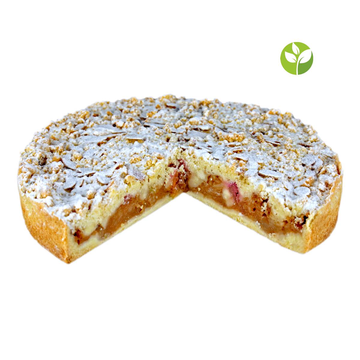 Ø 28cm | 12 Stücke | Zutaten: Margarine 3,18,I, Zucker, Mehl Aa,D,E,M, Vanillezucker, Backpulver 18, Apfel, Rhabarber, Apfelmus 6,18, Mandel Ja, Schneezucker