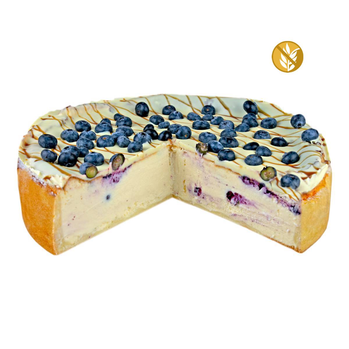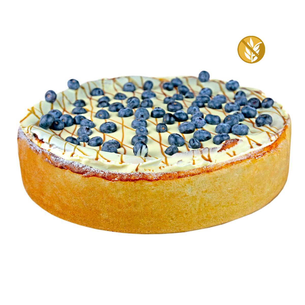 Ø 28cm | 12 Stücke | Zutaten: Ei K, Butter I, glutenfreie Mehl 8.2,17, Zucker, Backpulver 18, Vanillezucker, Milch I, Sonnenblumenöl, Vanillepudding 3,8.2,I,J,K,M, Magerquark I, Zitrone, Blaubeere, weiße Schokolade A,H,I,J,M, Karamellsauce 9,17,I