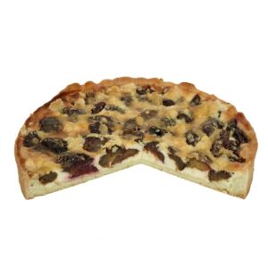 Ø 28cm | 12 Stücke | Zutaten: Butter I, Zucker, Ei K, Mehl Aa,D,E,M, Milch I, Sonnenblumenöl, Magerquark I, Vanillepudding 3,8.2,I,J,K,M, Vanillezucker, Backpulver 18, Pflaume, Mandel Ja, Schneezucker