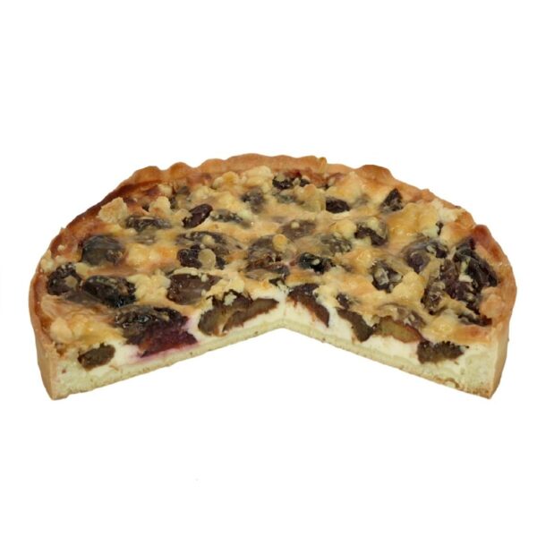 Mürbeteig, Vanille-Quarkfüllung, Pflaumen, Butterstreusel und Mandeln.