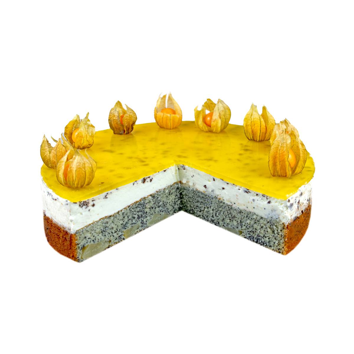 Ø 28cm | 12 Stücke | Zutaten: Ei K, Zucker, Sonnenblumenöl, Milch I, Vanillezucker, Backpulver 18, Mohn, Birne, Frische Sahne 17,I, Magerquark I, Sahnesteif 8.2,Aa,I,J,K,M, Zartbitter Schoko Splitter I,J, Mangosaft 6,18, Tortenguss 17,I